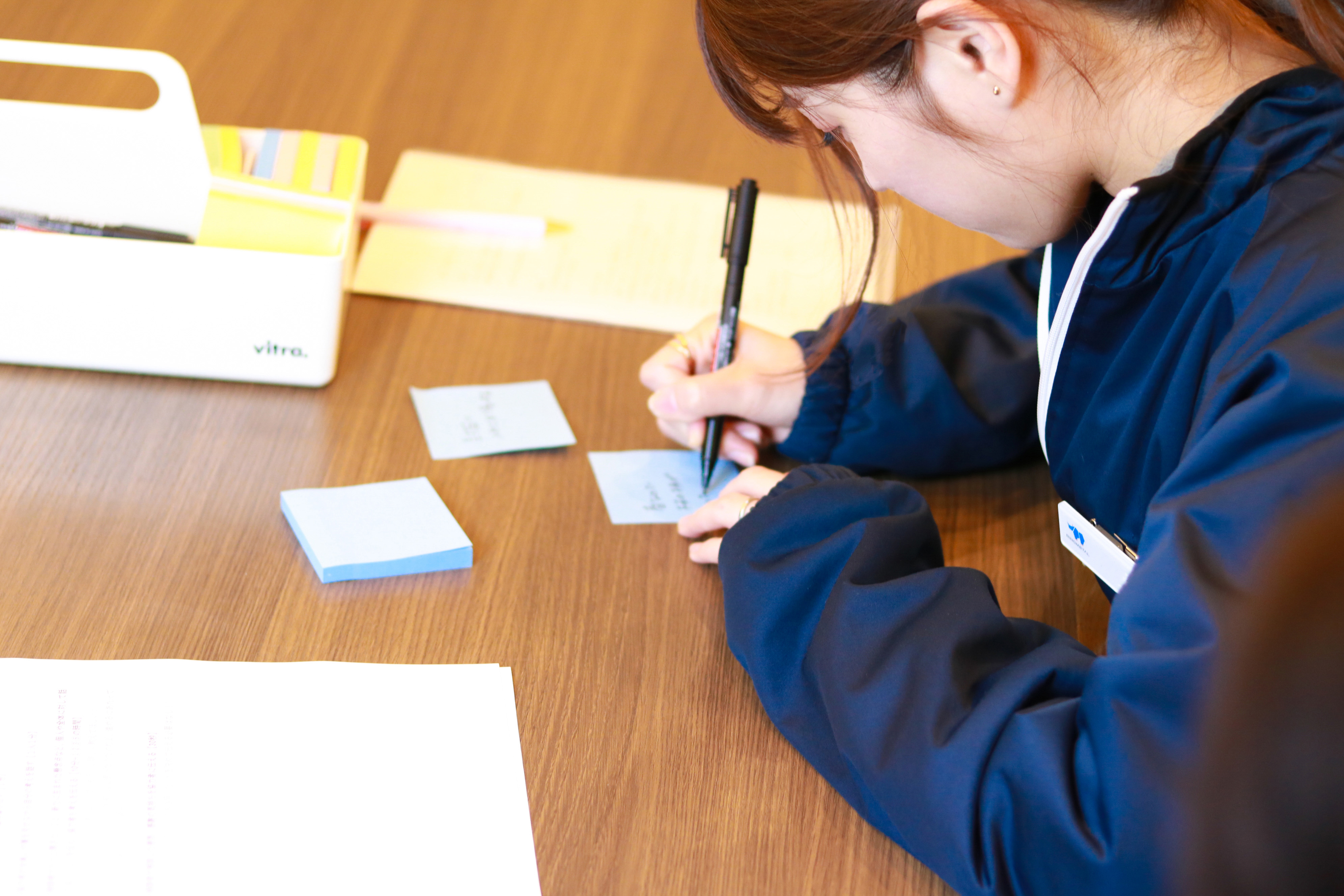 どの部署・プロジェクトの会議でも、「付箋」を使ったアイディア出しをよく行います。立場や発言の得手不得手に関係なく、それぞれが自分の考えを発信することができるのです。会社全体で「アイディア募集企画」を行う際も、大きな掲示板に模造紙を貼り、付箋を使ってみんなで意見を出し合います。
