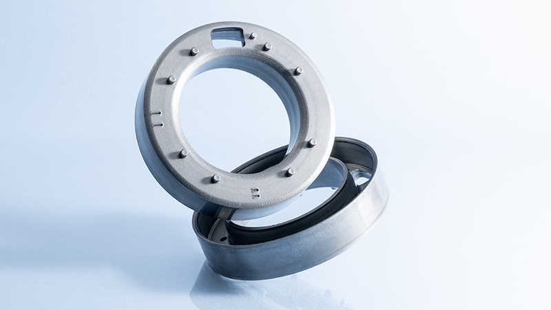 カーエアコンのコンプレッサ「空気を圧縮する部品」に使われる素材。当社は、1200トンプレス機という加圧能力の高い設備を使用して1ストロークで3つの部品を生産することができるため、コストを抑えながら大量に供給することができます。